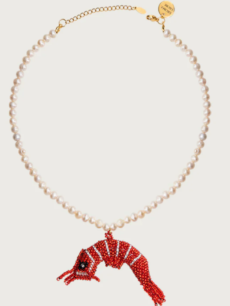 Reconozco que esto no está ya en mi lista de deseos porque ya lo tengo en casa desde hace una semana. Un collar de perlas 100% hecho a mano con el toque divertido de la gamba roja. Me parece que favorece muchísimo y perfecto para darle el toque a cualquier look básico de primavera-verano.
